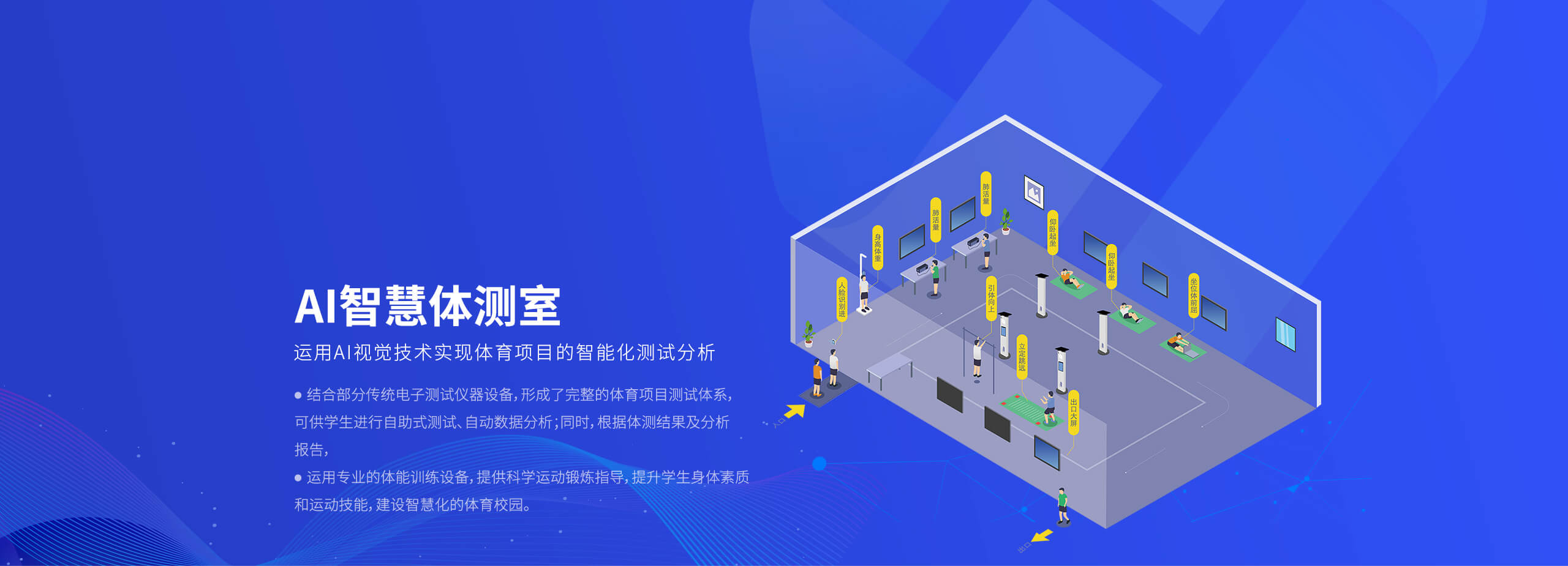智慧体测室是运用AI视觉技术实现体育项目的智能化测试分析。结合部分传统电子测试仪器设备,形成了完整的体育项目测试体系,可供学生进行自助式测试、自动数据分析;同时,根据体测结果及分析报告,运用专业的体能训练设备,提供科学运动锻炼指导,提升学生身体素质和运动技能,建设智慧化的体育校园。