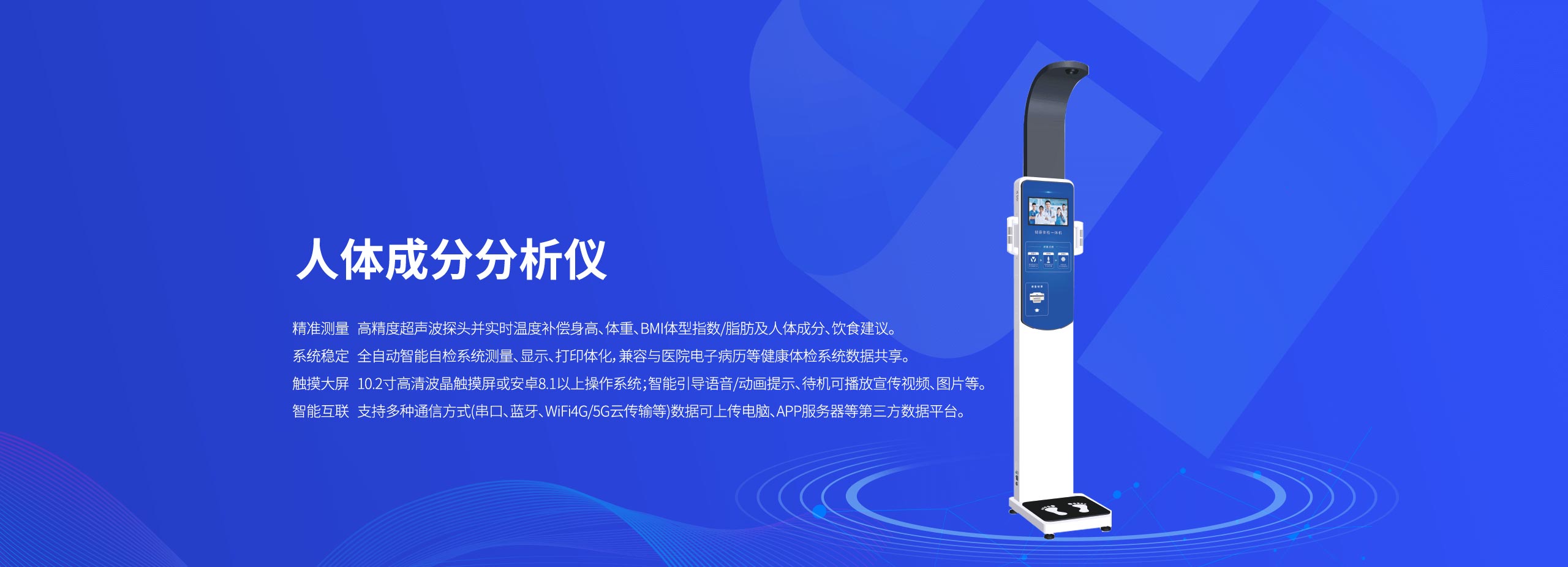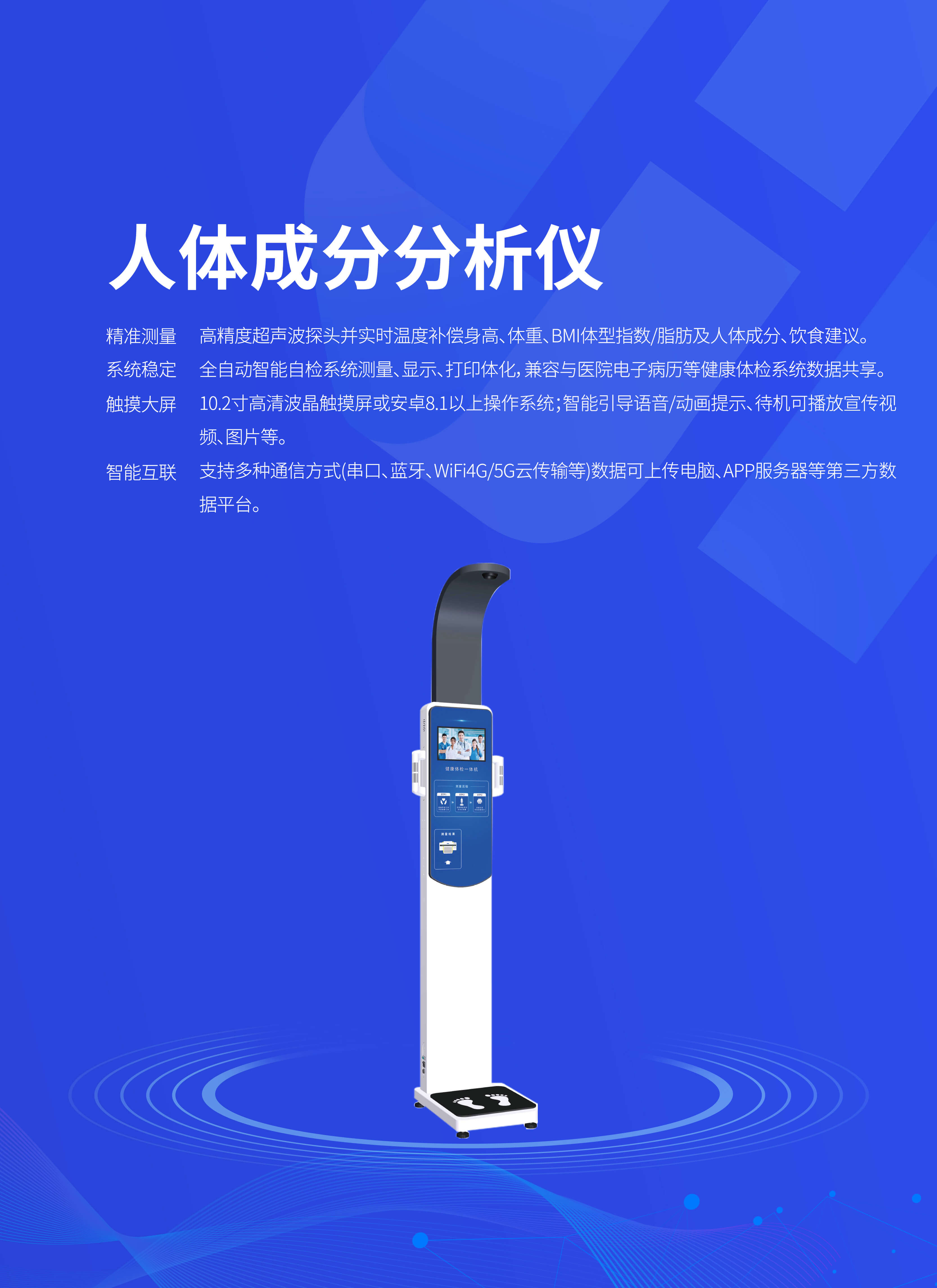 高精度超声波探头并实时温度补偿身高、体重、BMI体型指数/脂肪及人体成分、饮食建议。