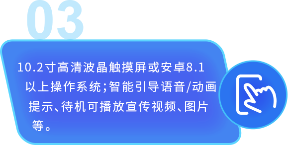 触摸大屏10.2寸高清波晶触摸屏或安卓8.1以上操作系统;智能引导语音/动画提示、待机可播放宣传视频、图片等。