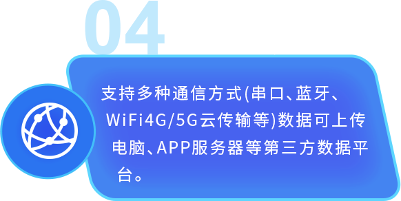 智能互联支持多种通信方式(串口、蓝牙、WiFi4G/5G云传输等)数据可上传电脑、APP服务器等第三方数据平台。