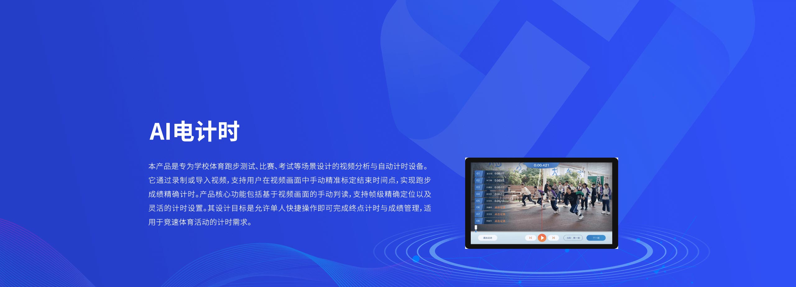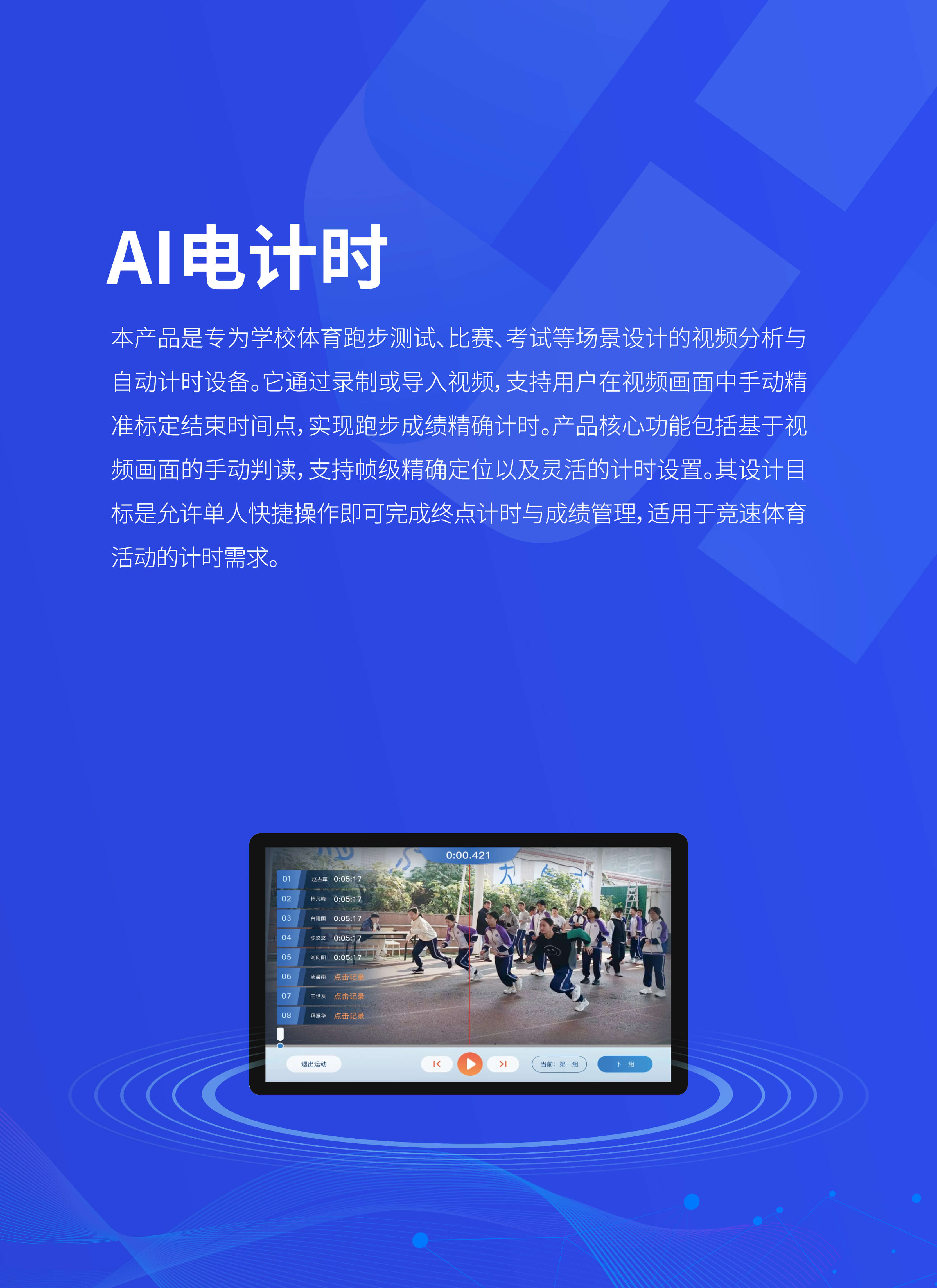 本产品是专为学校体育跑步测试、比赛、考试等场景设计的视频分析与自动计时设备。