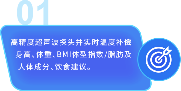 高精度超声波探头并实时温度补偿身高、体重、BMI体型指数/脂肪及人体成分、饮食建议。