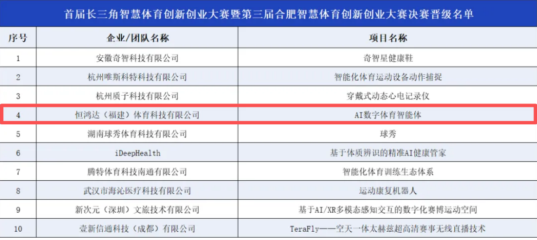 当智慧体育成为产业升级的“新引擎”,恒鸿达正以技术创新双轮驱动,在赛事竞技与学术研究领域同时传来捷报——近日,首届长三角智慧体育创新创业大赛暨第三届合肥智慧体育创新创业大赛决赛名单揭晓,恒鸿达凭借前沿智慧体育解决方案成功晋级!